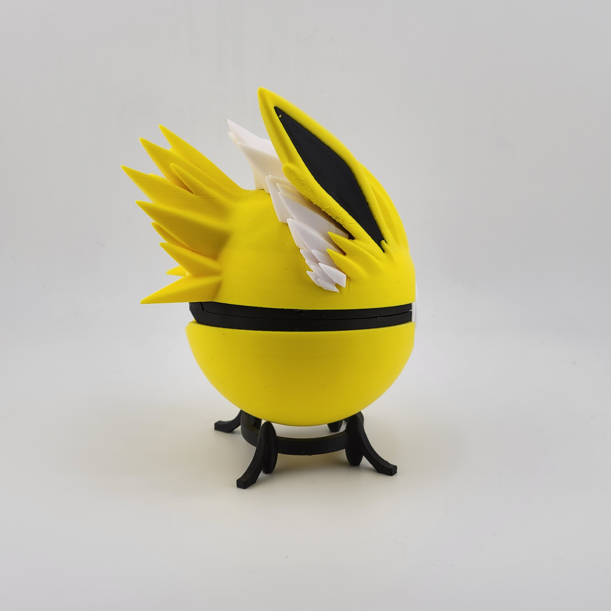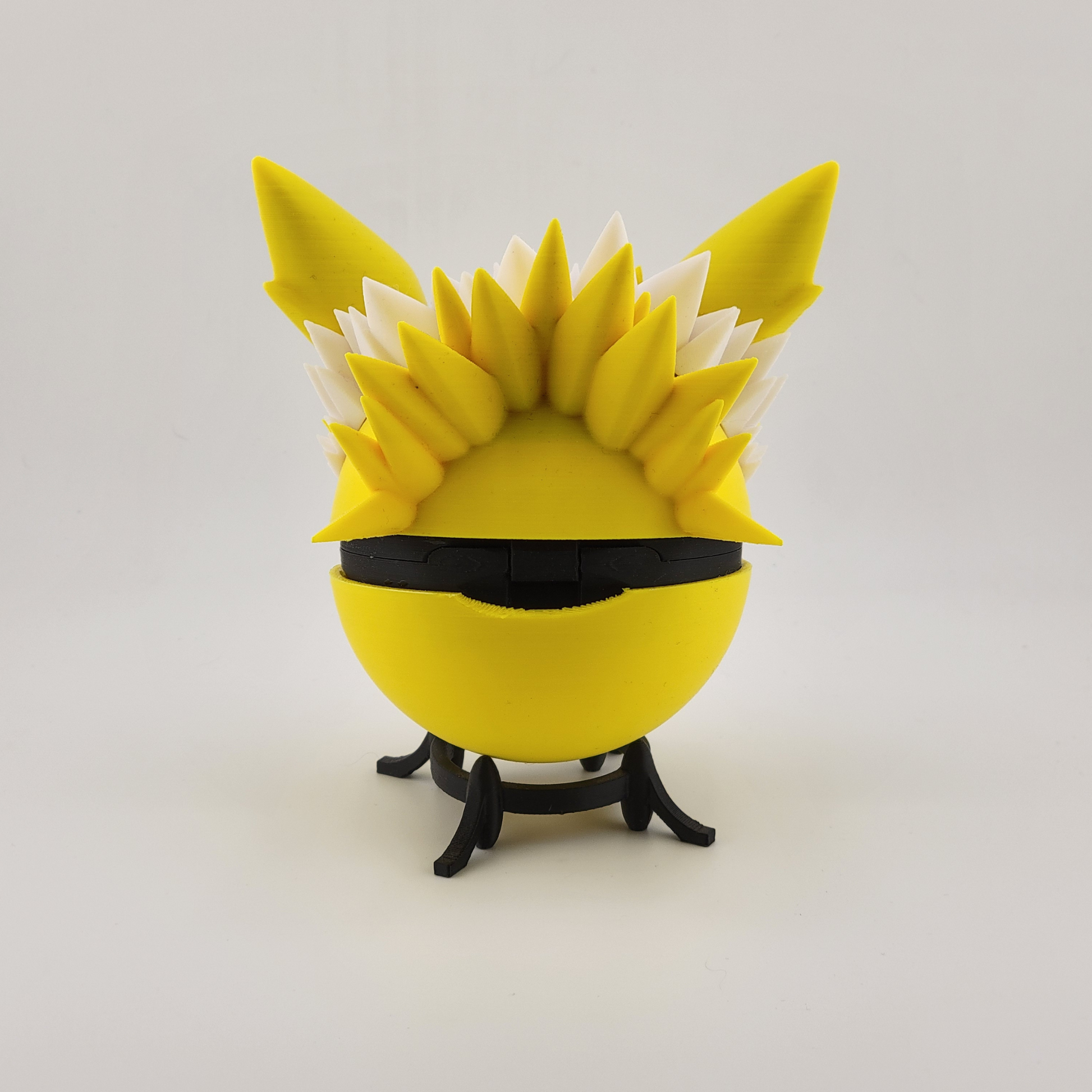 Step into a world where fantasy meets the real world—one 3D print at a time. This handcrafted Jolteon Pokeball is inspired by Pokemon's Jolteon, designed with fans in mind and brought to life with care, detail, and just a spark of mischief.